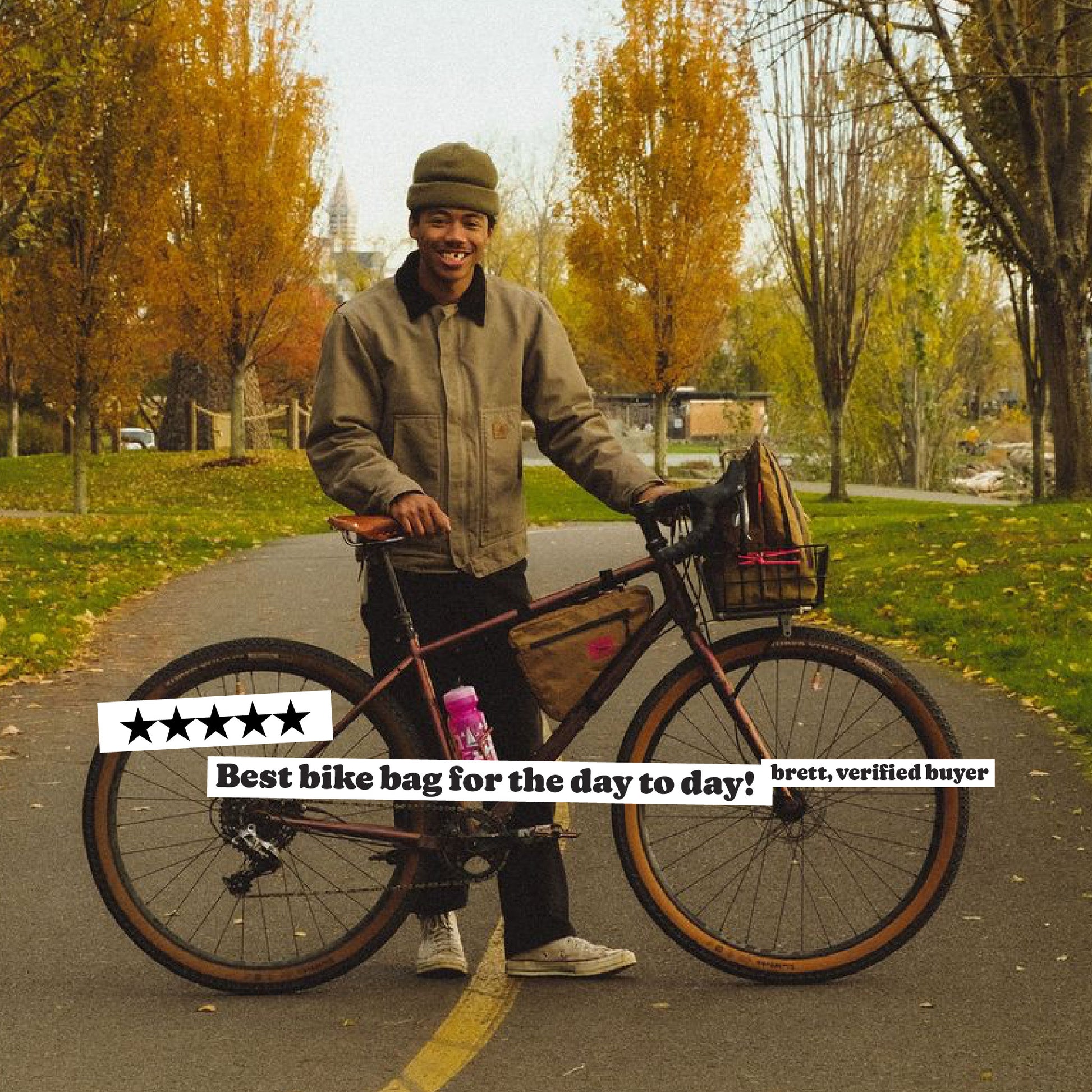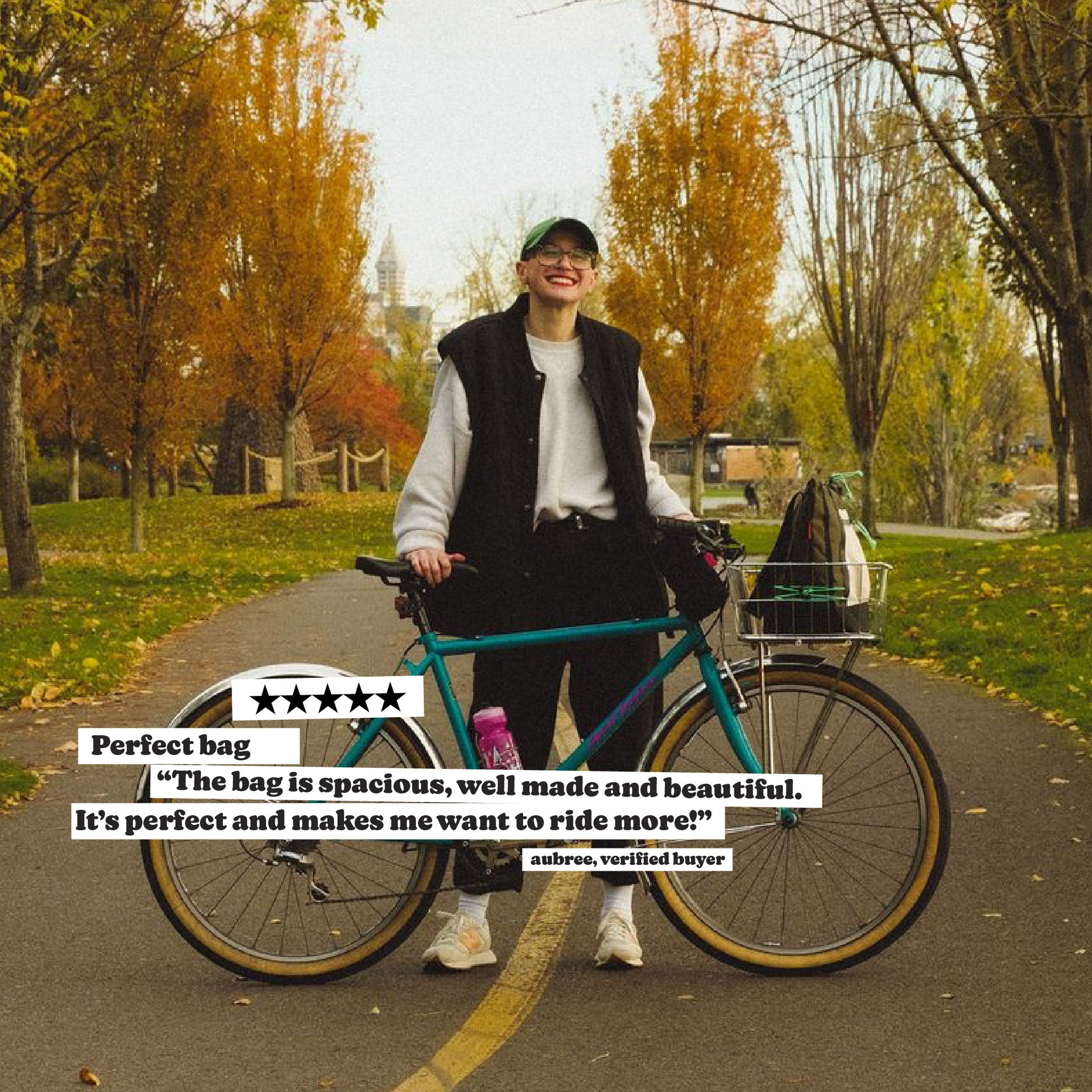 I’m in love with this bag. The bungee attachment on the side is so simple and effective. The bag feels secure and is easy to get on and off my bike. I also love being able to attach my bike lock key to the side of the bag. The bag is spacious, well made and beautiful. It’s perfect and makes me want to ride more!