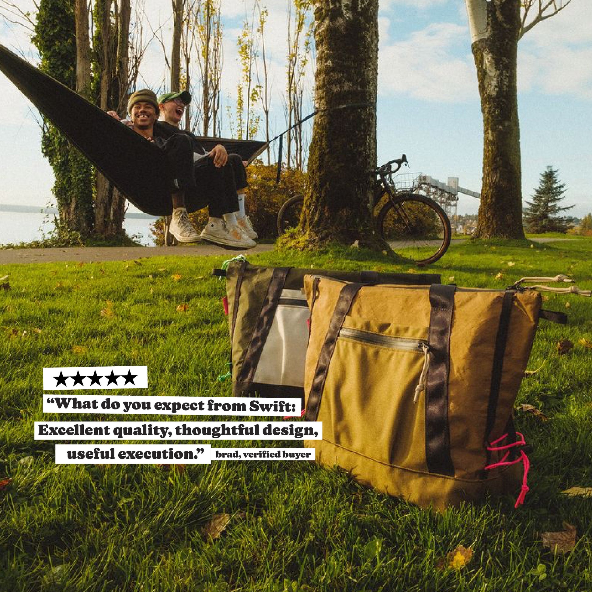 Say hello to the Acme Tech Tote Bag from Swift Industries. Our modern nod to a timeless classic is the perfect blend of function and style. This capacious little cutie features a roomy main compartment and a dimensional front pocket. Water resistant zippers keep your belongings out of the elements. Cleverly placed daisy chains and webbing loops add utilitarian attachment points for carabiners and clips. The Acme Tech Tote's soft, wide webbing handles make for a notably comfy off-bike carry experience. Unparalleled convenience whether you're commuting to work, running errands, or just out for a leisurely ramble on two wheels.