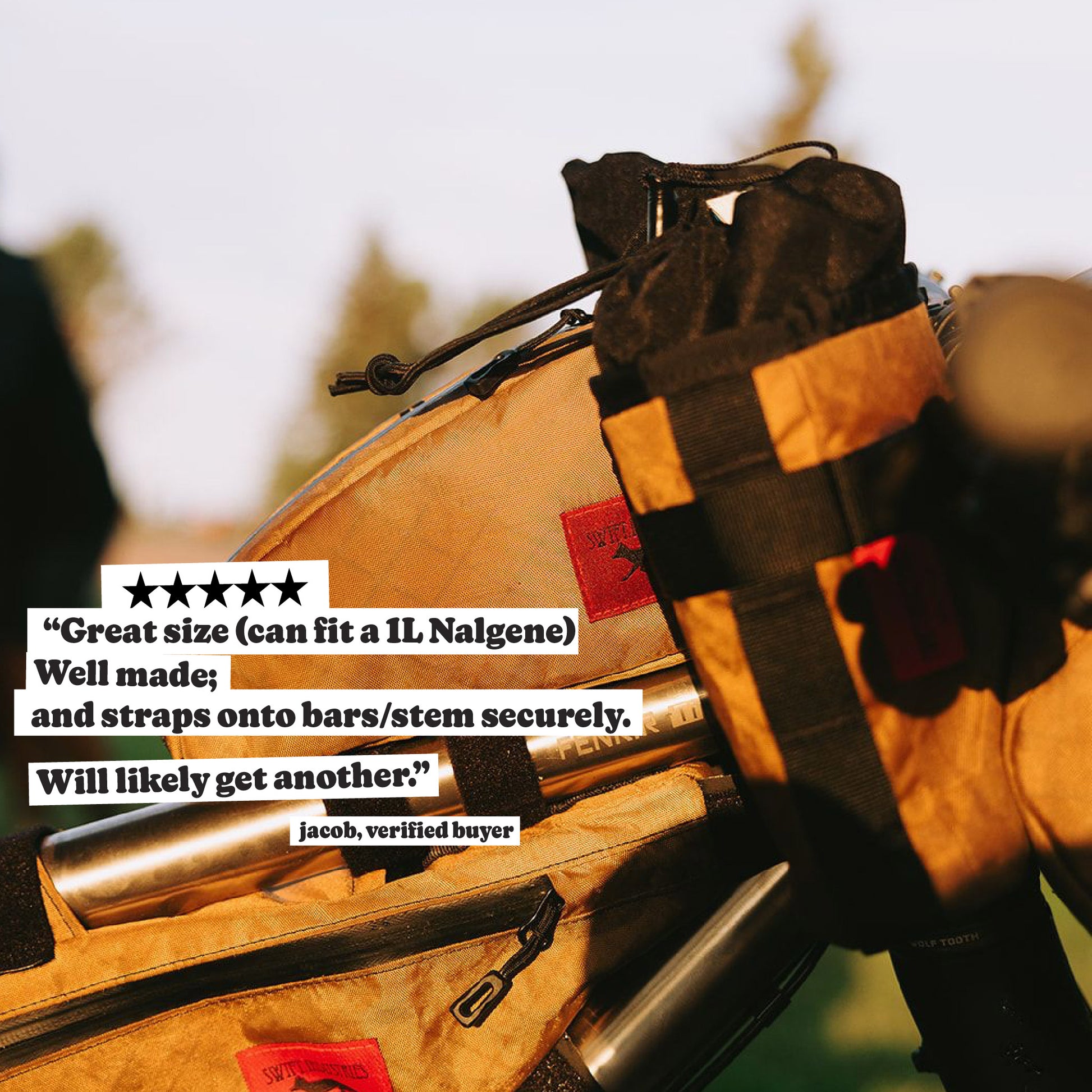 The super-sized Gibby Stem Bag is designed around a 32oz Nalgene bottle, giving it enough capacity to keep your snacks, hydration, and/or other essentials safe and sound, even on your longest, roughest bicycle adventures.