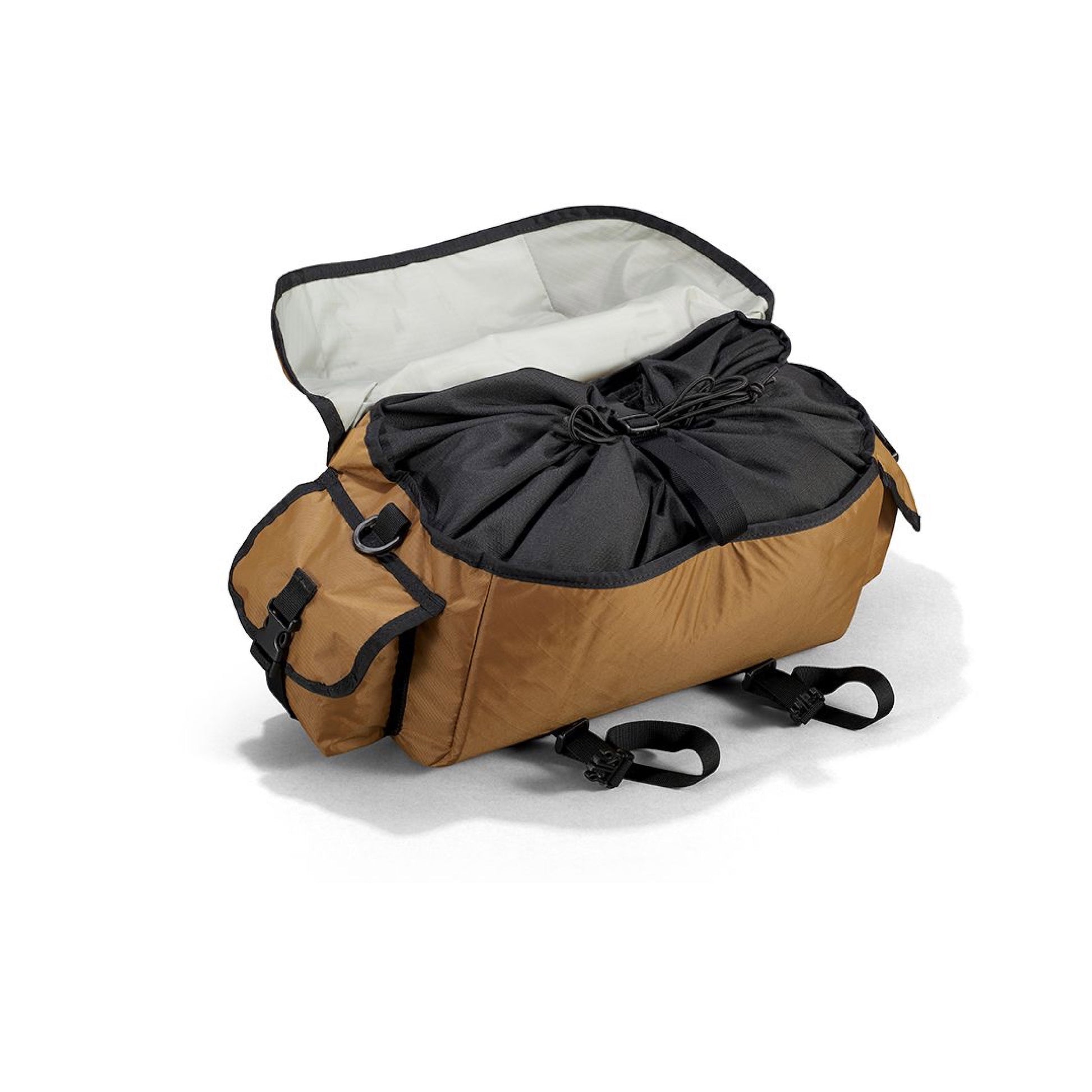 Presenting the best-selling Swift Industries classic, The Zeitgeist Pack. Adaptable attachment points make this bag a perfect fit for both handlebar and saddle carry. Its rigid liner ensures stability while an internal compression strap secures your cargo so you can shred to your destination, be that the grocery store or base camp. The fitted flap sheds the elements and features two daisy chains of webbing, perfect for lacing a Bungee Booster for a little added carry capacity. Collapsible side pockets give you a little more organizational space for all those bits & bobs.