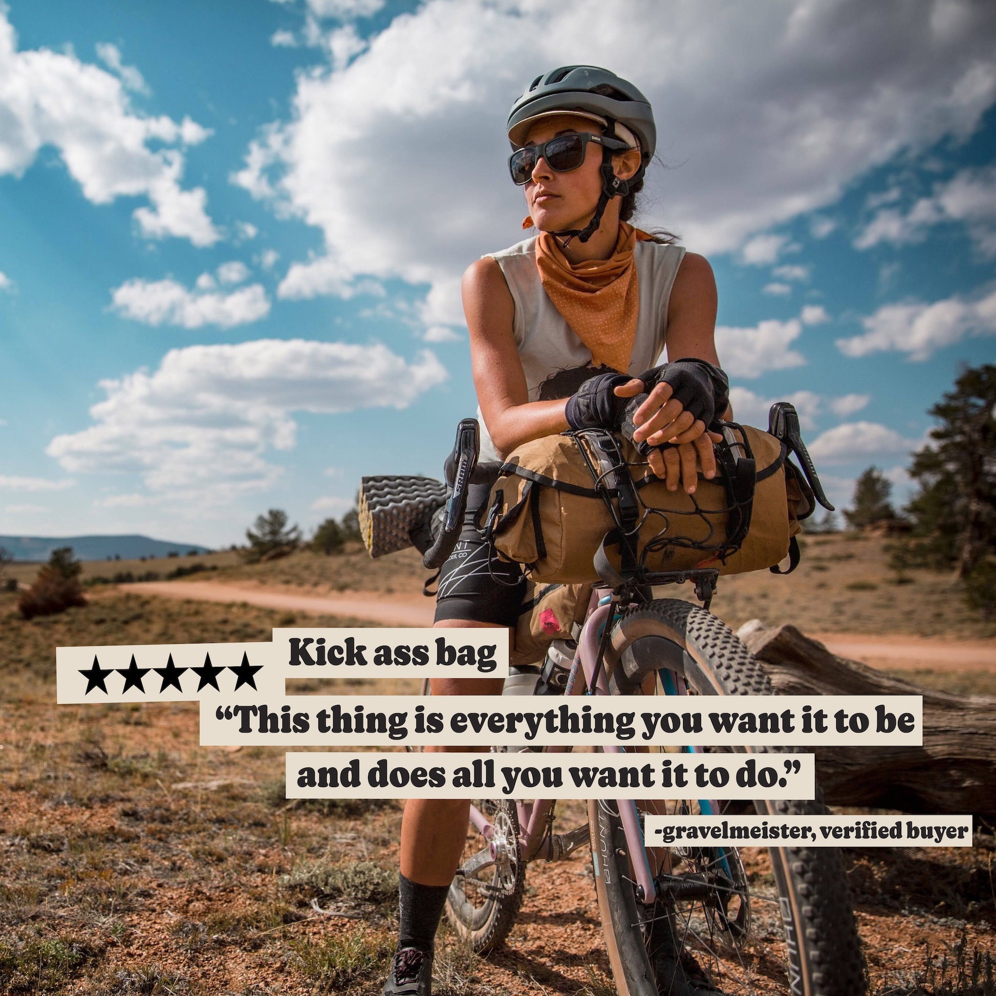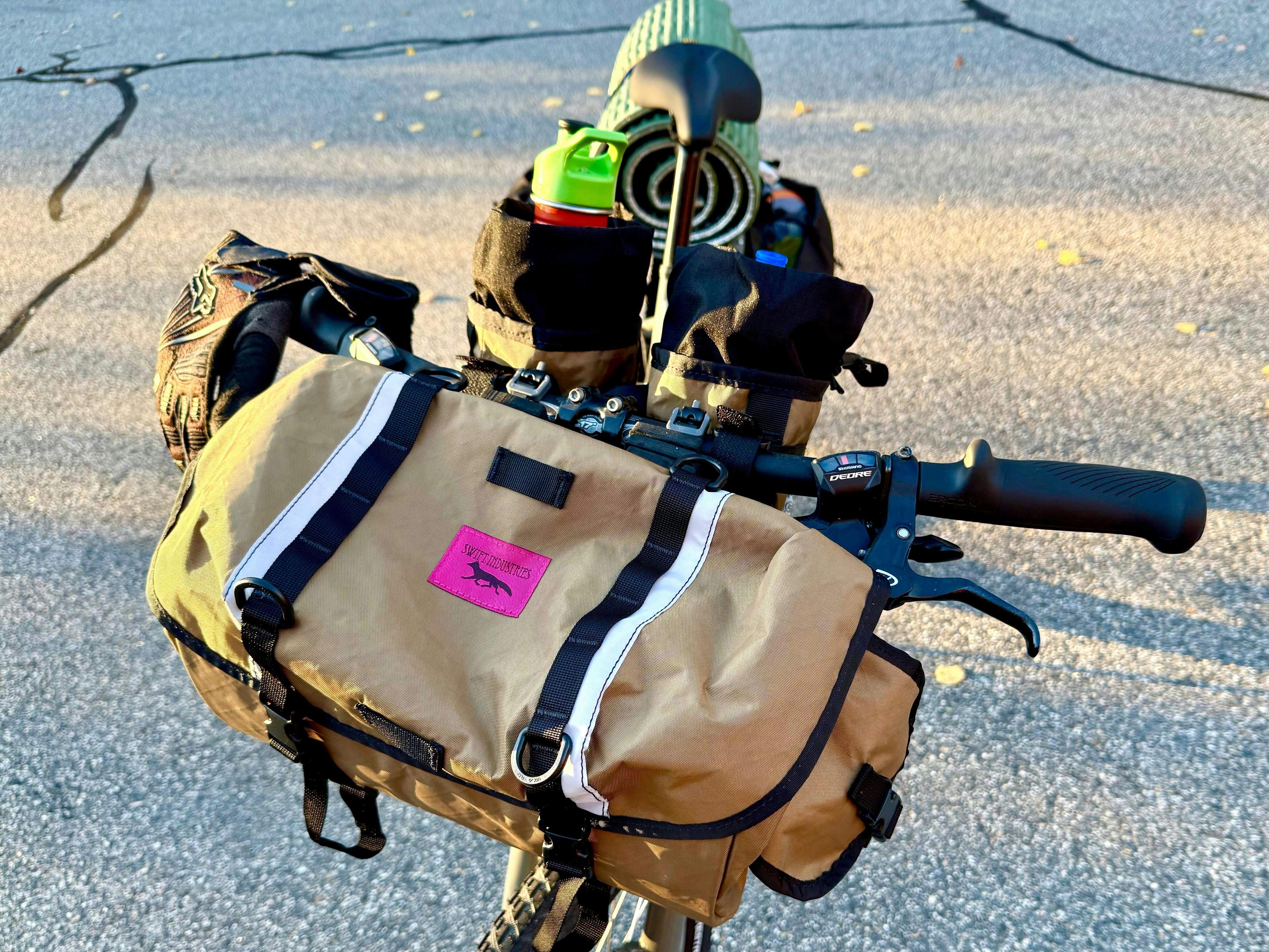 Changing to a top loading bag for my handlebars was a total game changer. This bag not only looks great, but is durable and holds a lot of gear. Plus the coyote color makes the tan sidewalls on my tires pop!